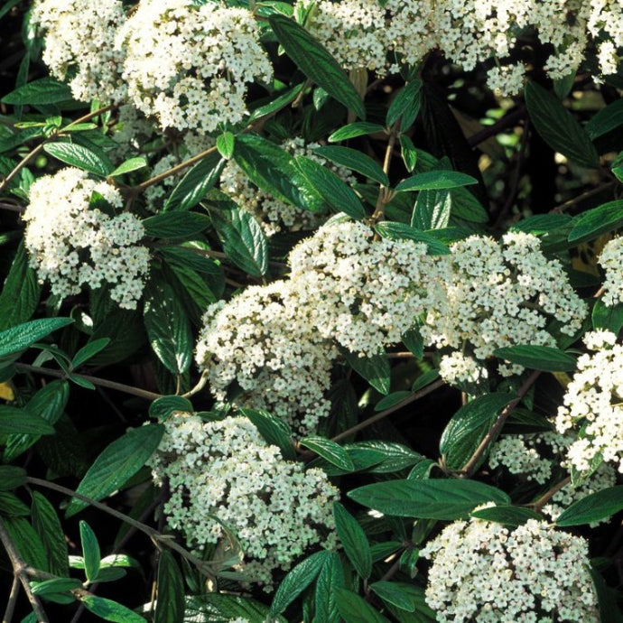 Prague Viburnum (Viburnum × pragense) is a dense, fast-growing shrub prized for its glossy green foliage and showy, fragrant white flower clusters that bloom in late spring. It typically reaches 10 to 12 feet in height and spread, making it well-suited for use as a hedge, screen, or specimen plant. In late summer to fall, it produces small red berries that mature to black, attracting birds and adding seasonal interest. This hybrid viburnum is adaptable to a range of soil types, tolerant of urban conditions, and requires minimal maintenance, making it a reliable choice for both residential and commercial landscapes.